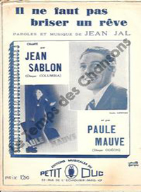 ![]() | Il ne faut pas briser un rêve, Même s’il vous semble un peu fou Tâchez donc que le mien s’achève Puisqu’il est plein de vous… Déjà me blottissant dans vos bras. Je sens que votre étreinte me ment… Il ne faut pas briser un rêve Même s’il vous semble un peu fou… |