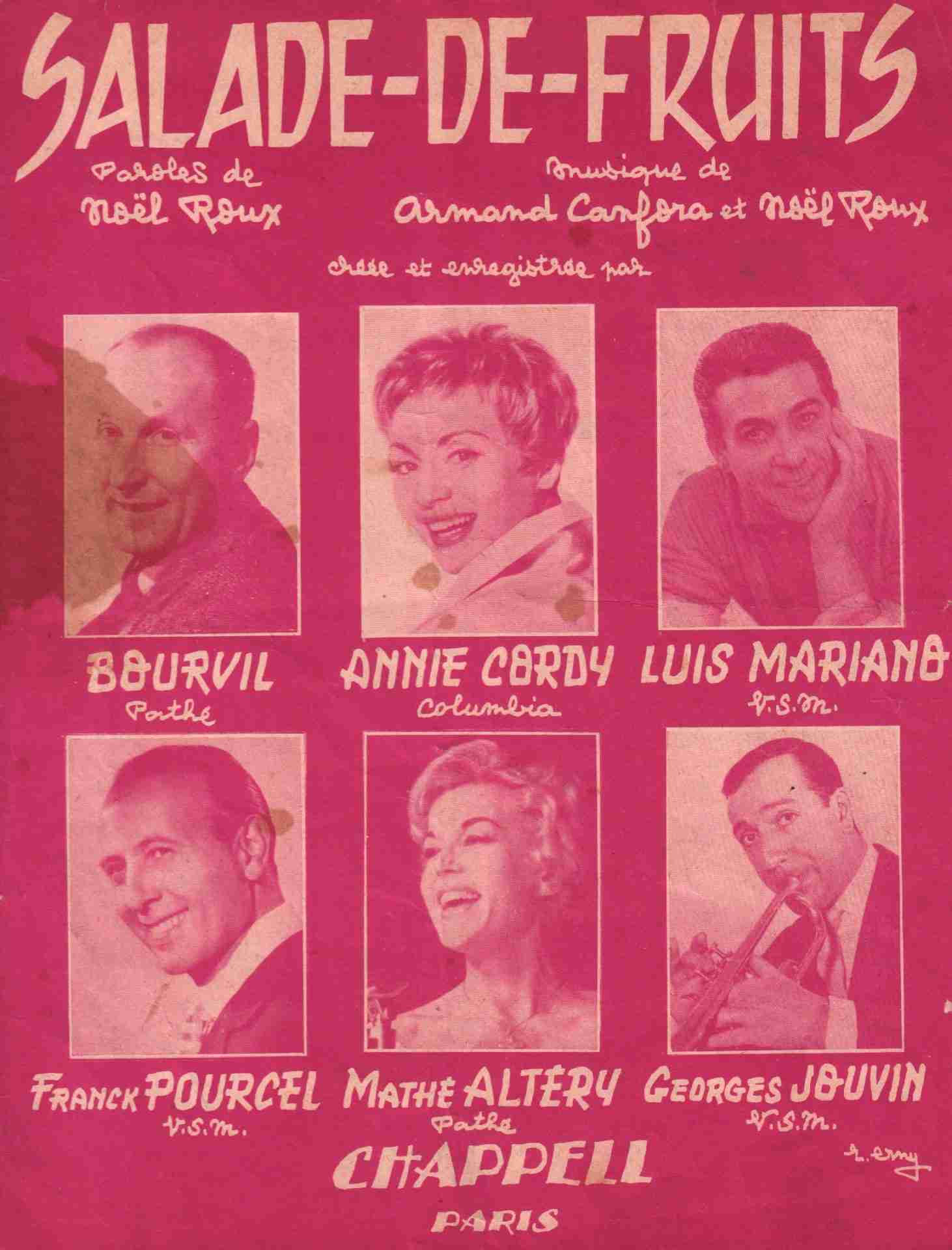 ![]() | Ta mère t’a donné comme prénom, Salade de fruits, ah, quel joli nom Au nom de tes ancêtres hawaïens, Il faut reconnaître que tu le portes bien Salade de fruits, jolie, jolie, jolie, Tu plais à mon père, tu plais à ma mère Salade de fruits, jolie, jolie, jolie, Un jour ou l’autre, il faudra bien qu’on nous marie |